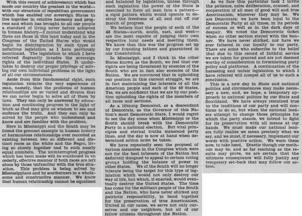 “Their objective is to gather the votes of organized minorities in the North who are not in the bag and who are not to be taken for granted. The Northern drive against the South is based upon the cold-blooded propositions that our people will be foolish and weak enough to continue to meekly follow the party line, even though the party is bent upon our destruction. The people of the South must take their stand. If we do not take political action, we will be socially and economically destroyed. We have within our hands the power to stop this drive against us. We hold the balance of power in the nation.”