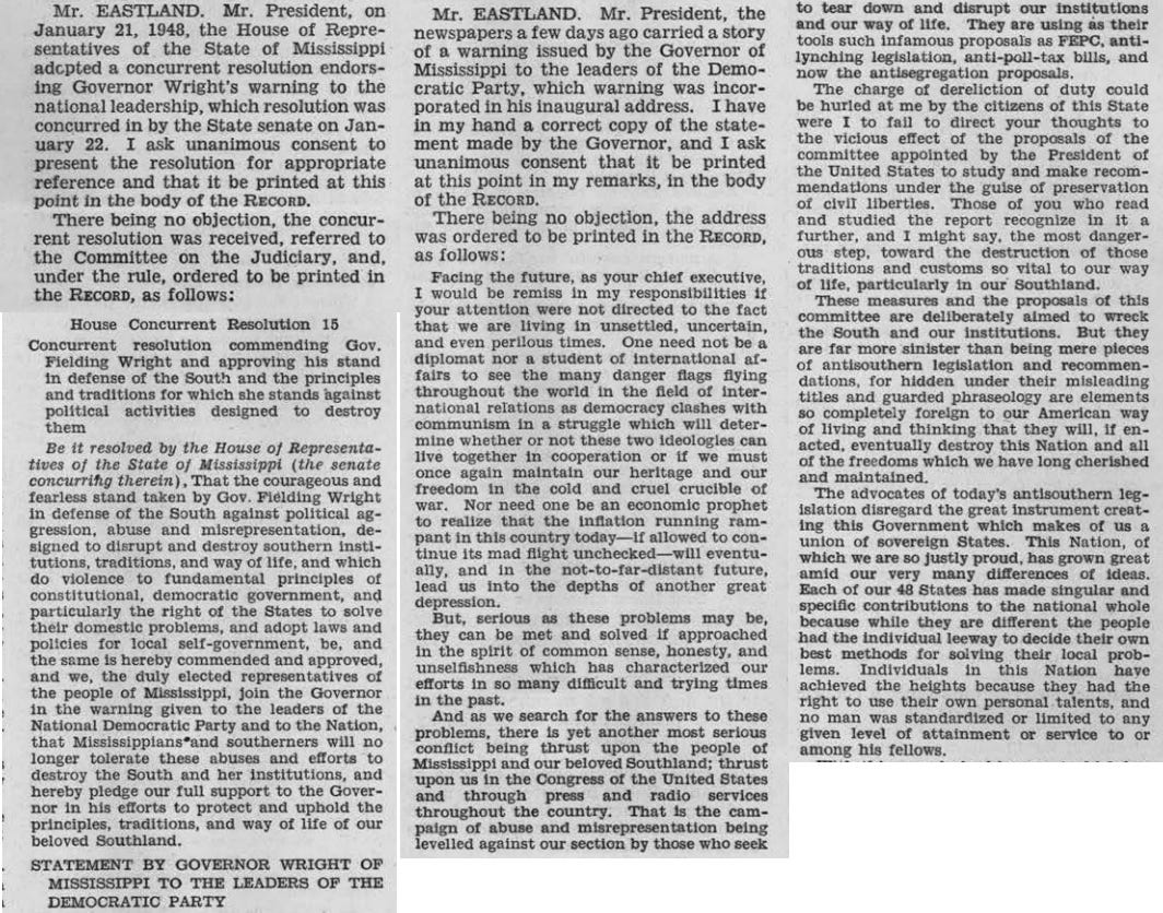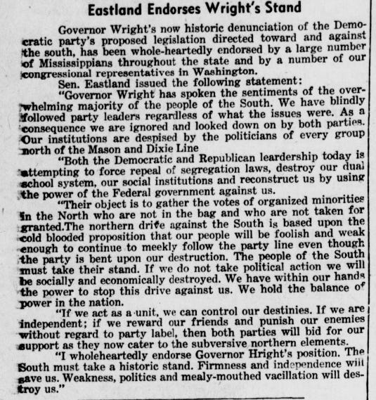 James Eastland said, “Governor Wright has spoken to the sentiment of the overwhelming majority of the people of the South. We have blindly followed party leaders, regardless of what the issues were. As a consequence, we are ignored and looked down upon by both parties. Our institutions are despised by the politicians of every group North of the Mason and Dixie lines.